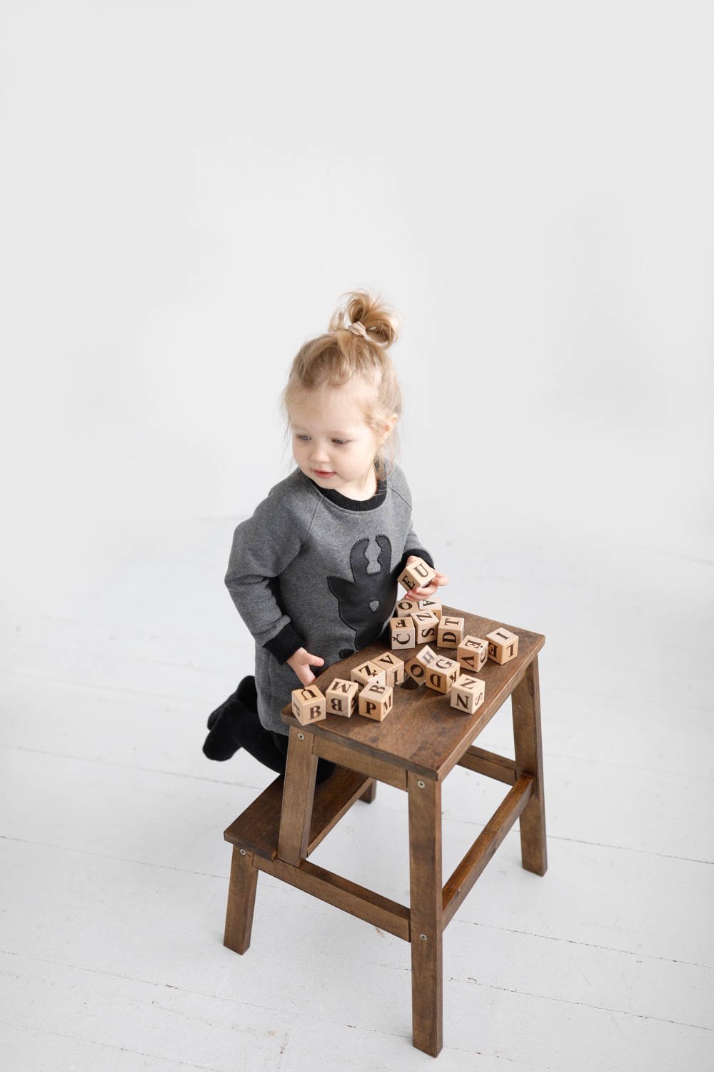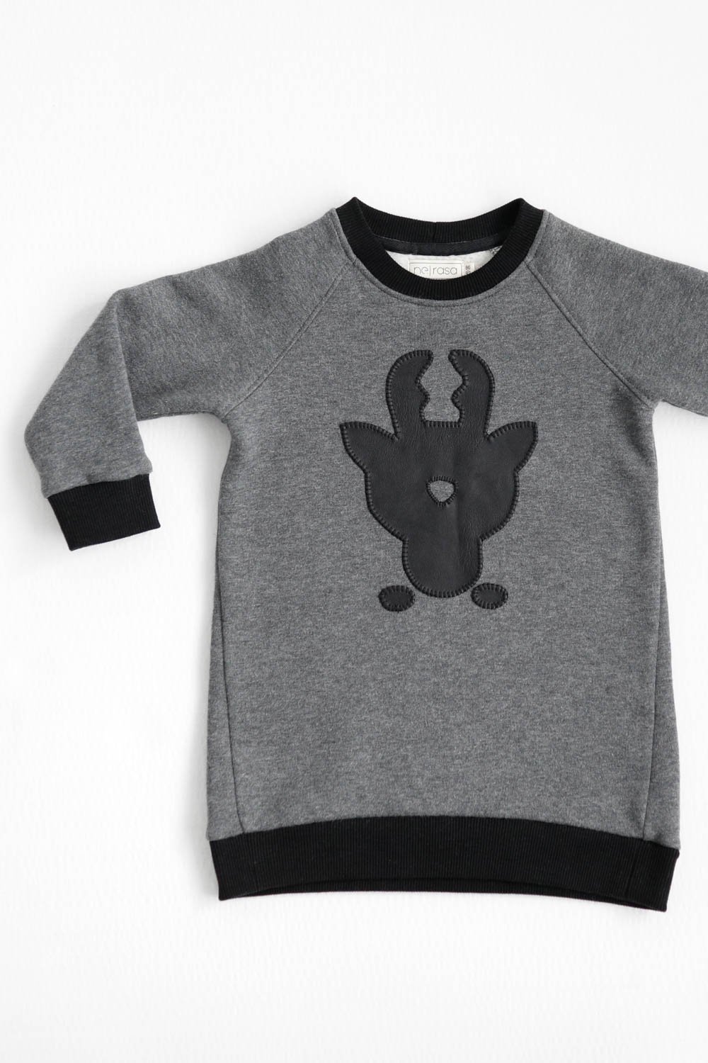Patogus, šiltas, ilgas džemperis mergaitei su rankų darbo eko odos ELNIUKO aplikacija.