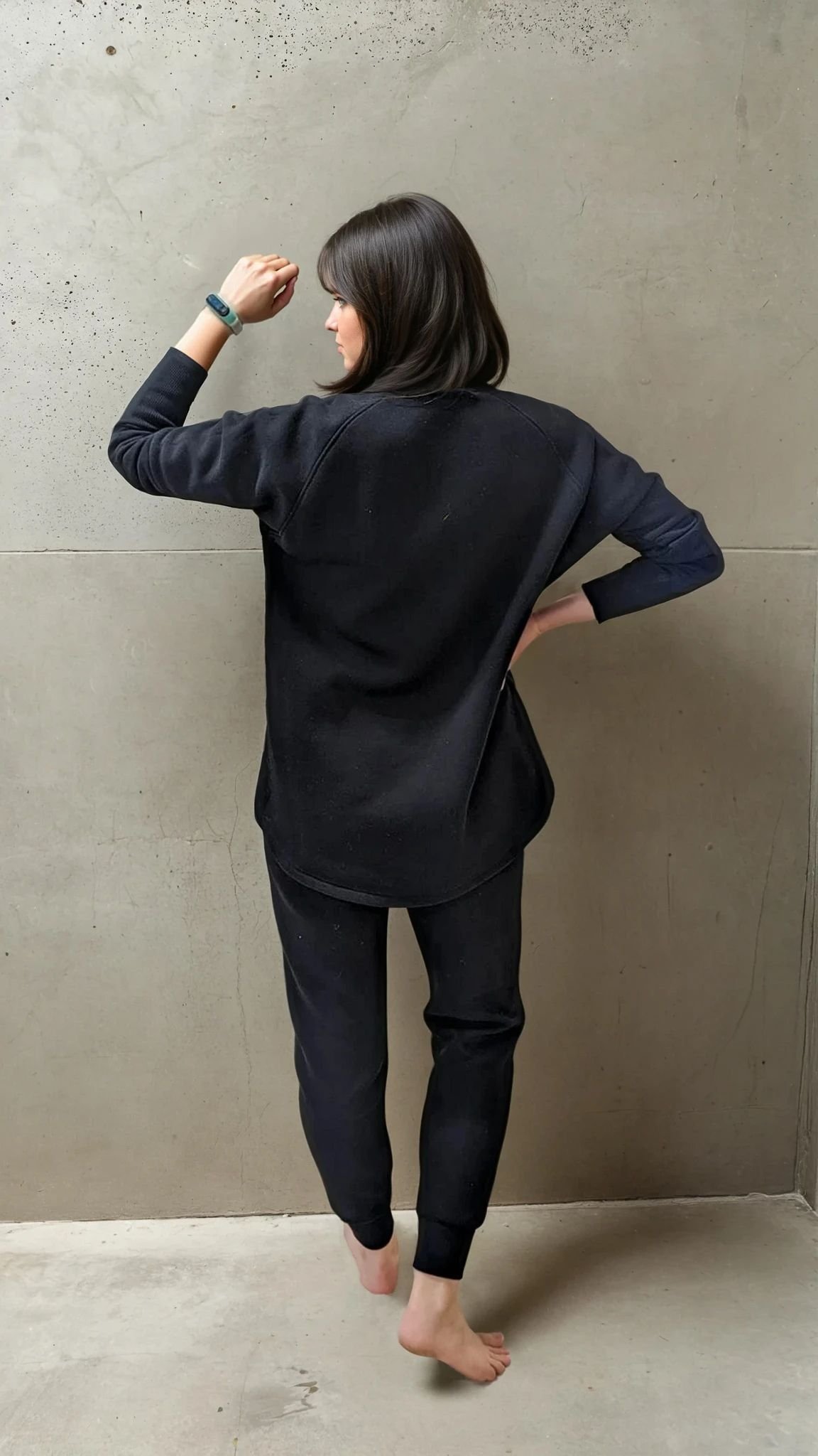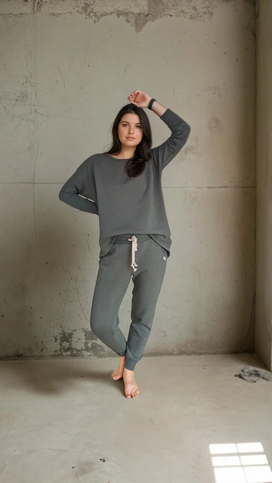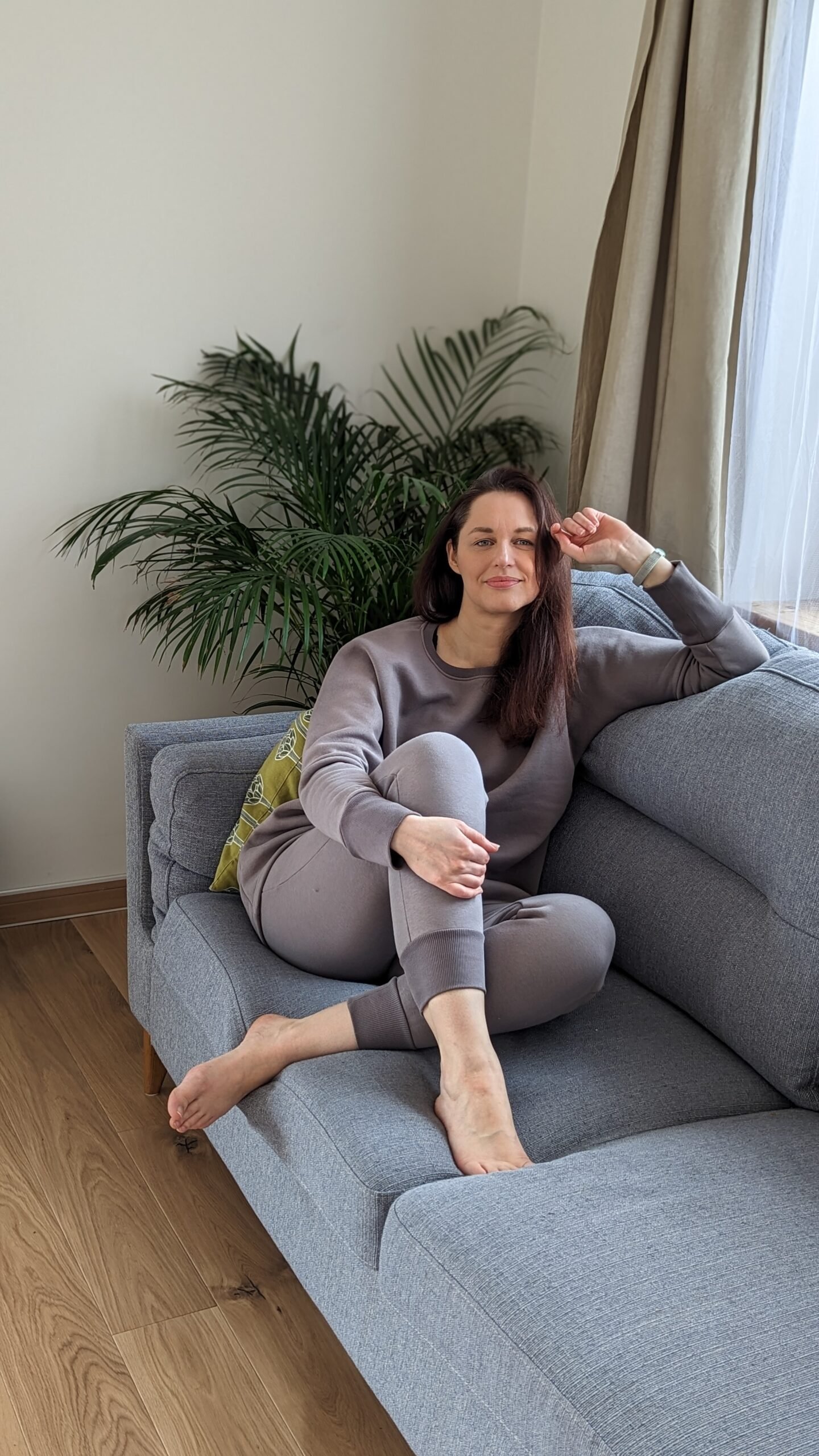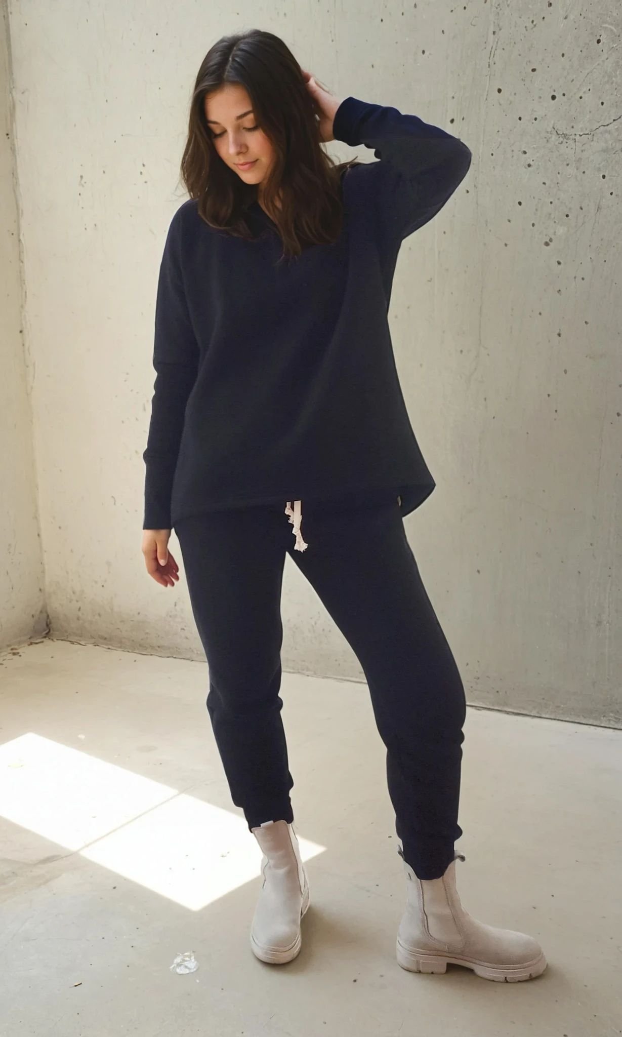 Stilingas, minimalistinis, patogus moteriškas laisvalaikio kostiumėlis. Kelnės su plačia guma ir raišteliu juosmens dalyje bei kišenėmis. Palaidinė oversize tipo, nevaržanti judesių.